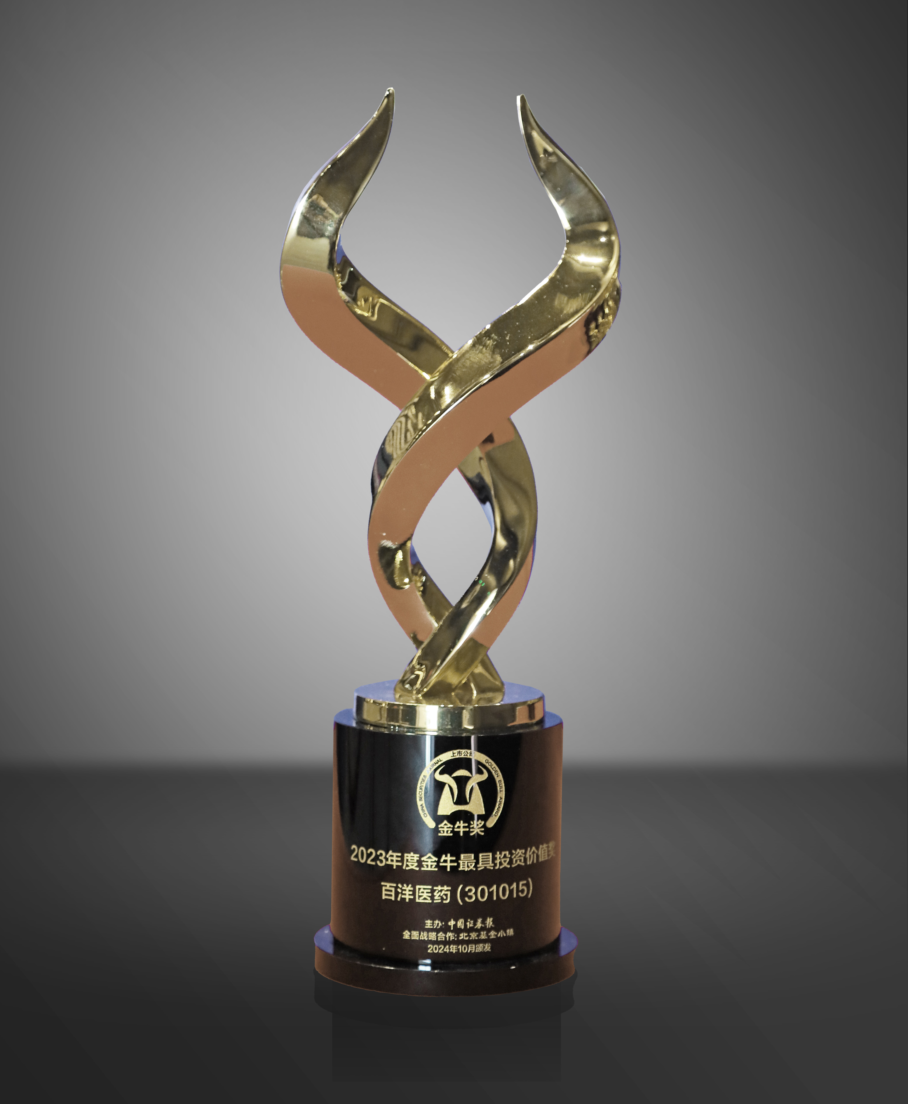 作为中国资本市场最具权威与公信力的奖项之一,“上市公司金牛奖”是新华社旗下中国证券报主办的金牛系列评选活动之一,自1999年设立以来,以严苛的标准和专业的评审,成为衡量上市公司高质量发展的金标准,被业界誉为财经领域的“奥斯卡”。凭借出色的盈利水平和强劲的发展潜能,百洋医药荣获“2023年度金牛最具投资价值奖”。